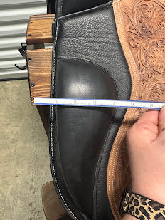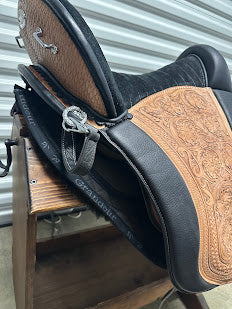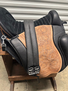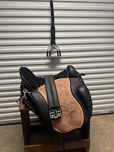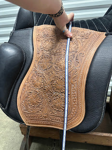 This saddle is a real head-turner—the natural tooling and sleek black suede make it stand out, and you'll get tons of compliments wherever you ride. Versatile, comfortable, high-quality, and ready for your next adventure!